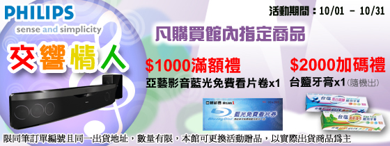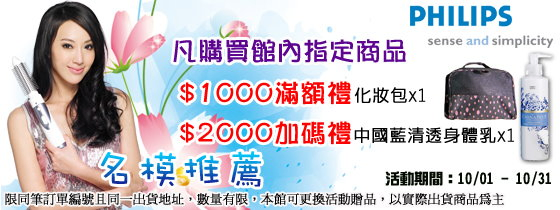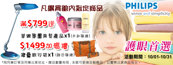麗歌網路商城:飛利浦優質生活館於10/1隆重開幕!開幕期間全館免運費,任購1件即可免費送貨到府。除價格優惠外,另有滿額贈品及加碼贈品,讓你好禮獎不完!快到優質生活館來搶好康!http://www.leico.tw/